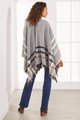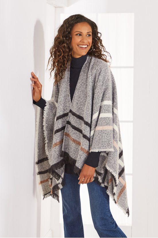 Your chilly weather wardrobe requires this easy wrap, super-soft and subtly textured, lightweight but warm. Patterned with overlapping tan, white, and black stripes on neutral grey, it's finished with fringed edges and an open front.