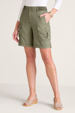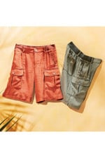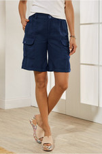 Laid-back yet luxe, these essential shorts are designed with amazing fabric, a cool wash,and plenty of pockets for all your take-along treasures: two front cargo pockets with button flaps, two vertical hand pockets, two rear patch pockets. Slimming seam lines, comfy waist with elasticized back, just-right cuffs. Sits at natural waist.