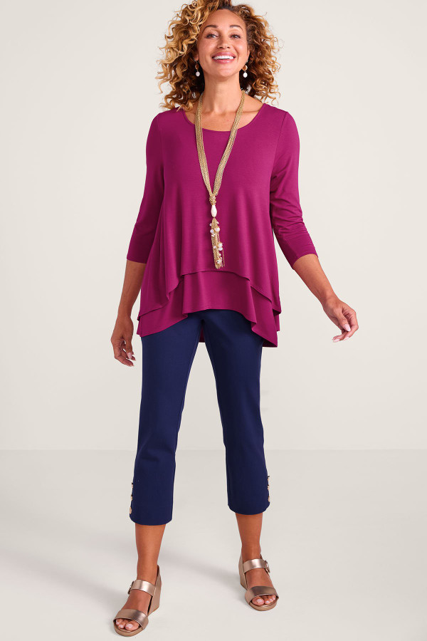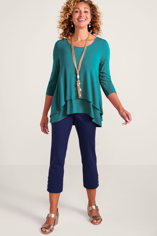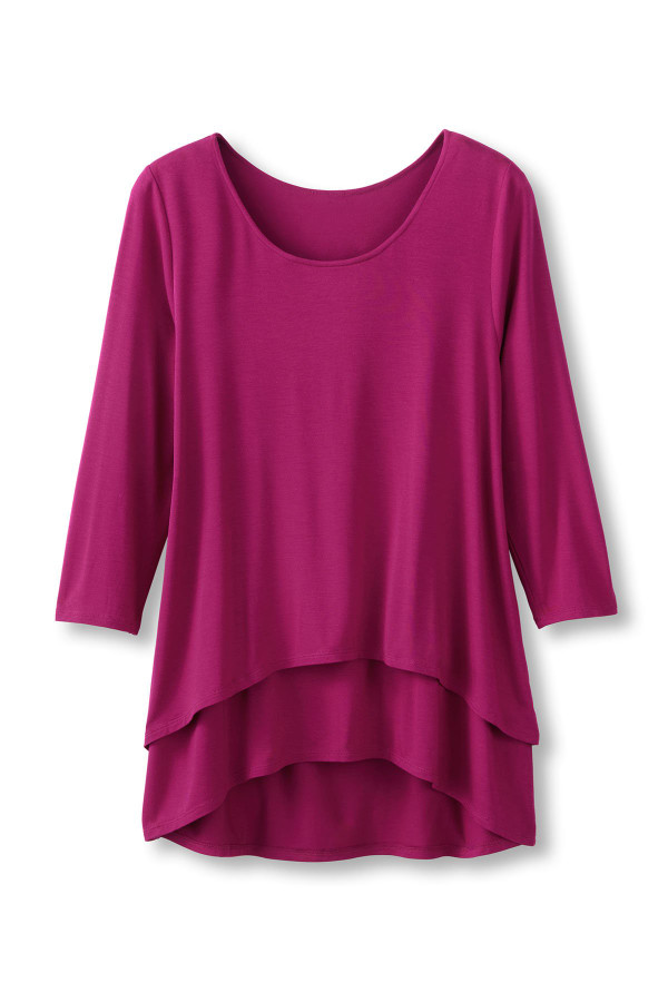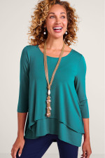 This soft knit scoop neck top flatters with a double-layer drapey silhouette and 3/4 sleeves. The high-low curved hem adds movement and depth, while a split back adds layered interest. A versatile piece in midweight rayon/spandex.
