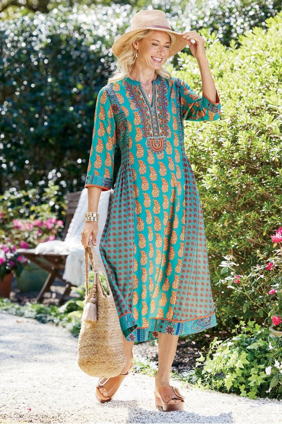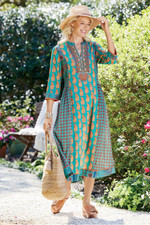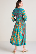 This mid-length dress has a beautiful mix of patterns to create a unique style. 3/4 length sleeves, v-neckline. Smocking at sides and center back waist.