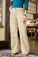 Right on trend, these wide-leg jeans have pintuck details at the front legs for an elongating effect. They’re cut to a full length in stretch denim that’s soft washed for a vintage look. A fly front, belt loops and five pockets finish off the style.