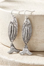 These silver fish earrings dangle with artisanal texture and whimsical detail. The fin design creates gentle movement as you wear them. Pair with the matching necklace (1DM42) for coordinated coastal style. French wire back.