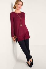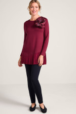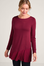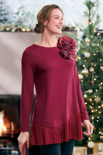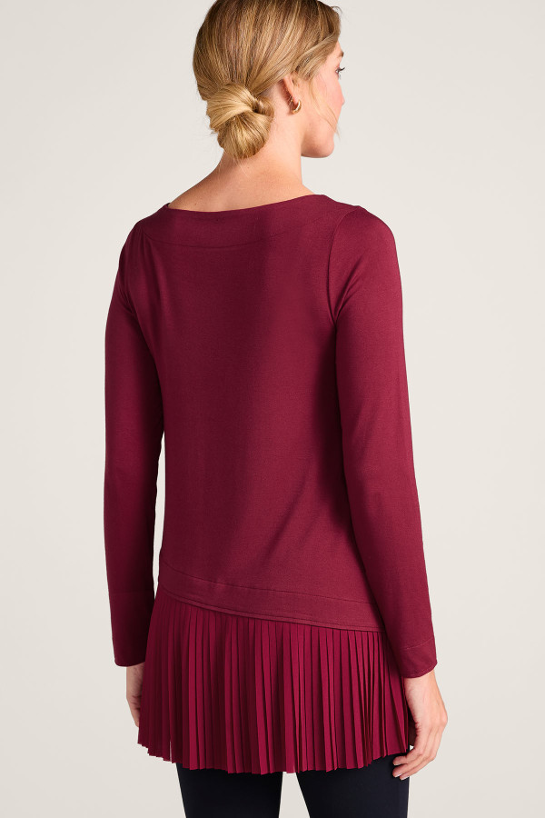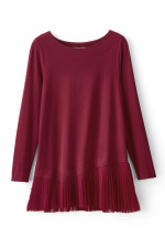 Flowing pleated chiffon adds movement and a hint of drama to this easy knit tunic. Styled with a boatneck, long sleeves and a slight high-low hem with asymmetric knit body for comfortable sophistication.