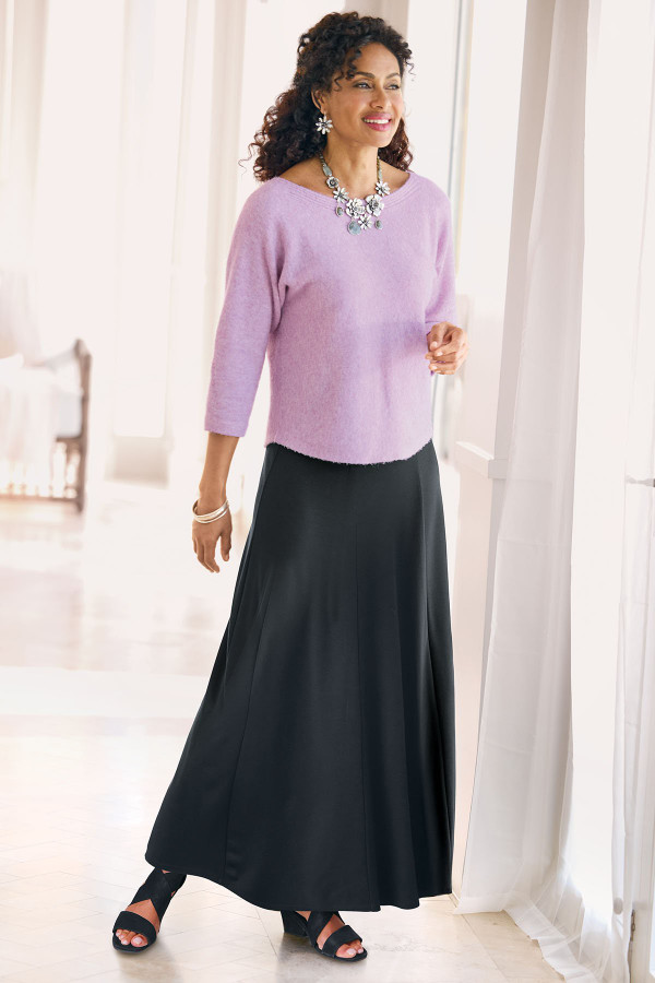 If getting dressed is the problem, this ponte maxi skirt is the solution. The drapey silhouette is designed with gores to create a flattering, full sweep, and the elastic waist offers pull-on comfort and ease. It's a simply sophisticated skirt that instantly makes every outfit.