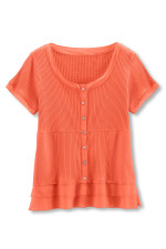 This tee features soft cotton ribbed knit with a seamed bodice and cotton voile ruffle trim for feminine detail. The button front and cap sleeves create classic styling while side slits add easy movement. A refined take on casual comfort for everyday.