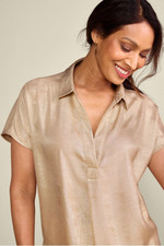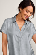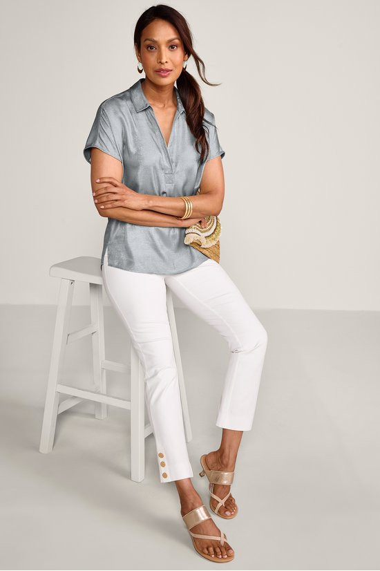 Looking to shine bright hosting or attending a party? This dolman sleeve top will surely do the trick! The classic shirt collar leads to a sleek split neckline that makes just enough room for the addition of a sparkly necklace. And the trendy high-low hem allows you to pair it with endless bottom options yes, even leggings!