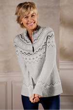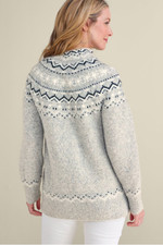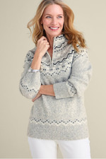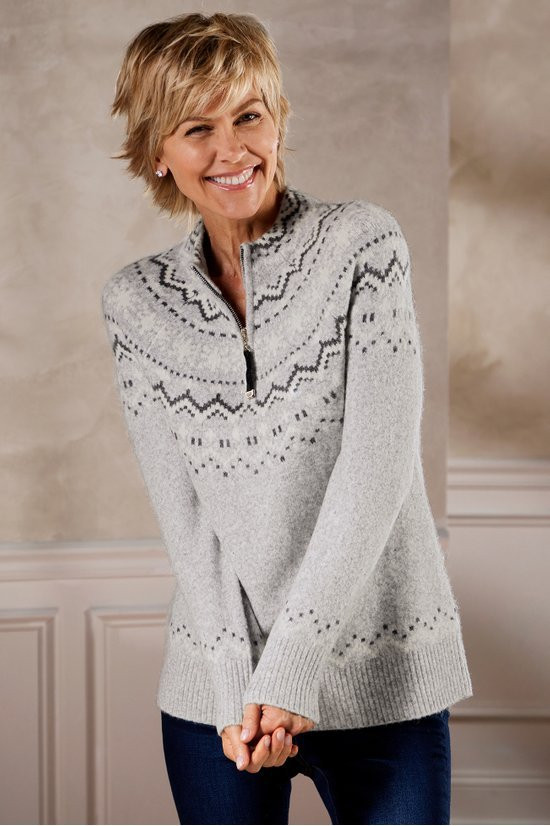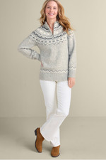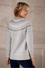 Lofty and soft, this cozy knit features a festive Fair Isle jacquard for seasonal charm. Finished with a zippered funnel neck and long raglan sleeves for a relaxed, wintry look.