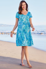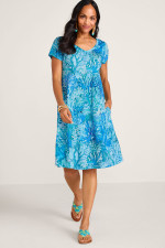 This short-sleeve, knee-length dress features a soft cotton-modal blend that gently flares from bust to hem for flattering drape. The V-neck creates an easy silhouette while pockets add convenience.