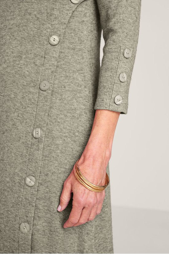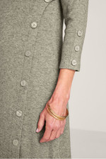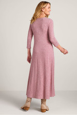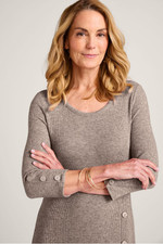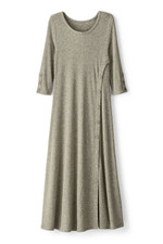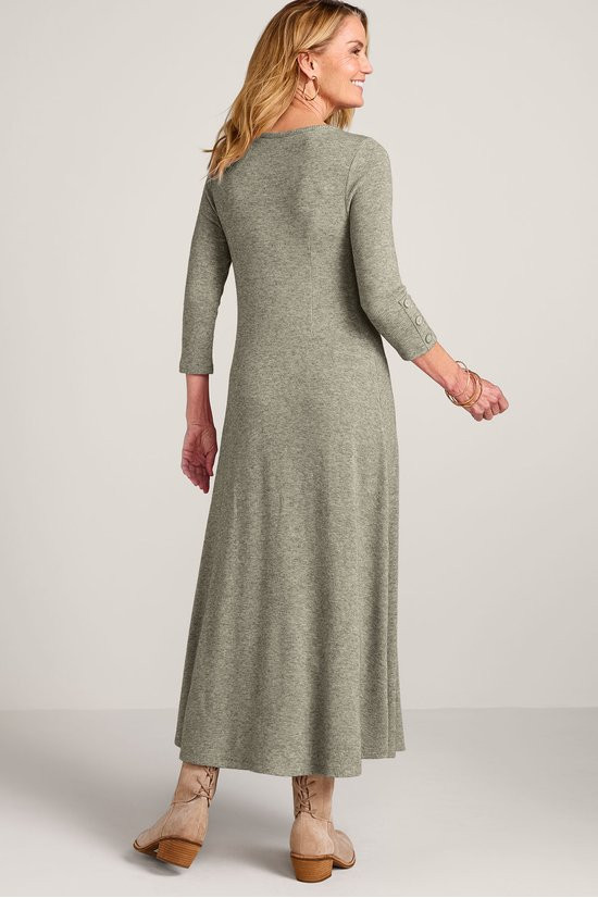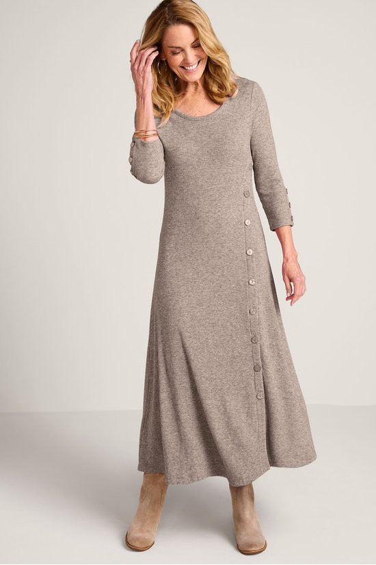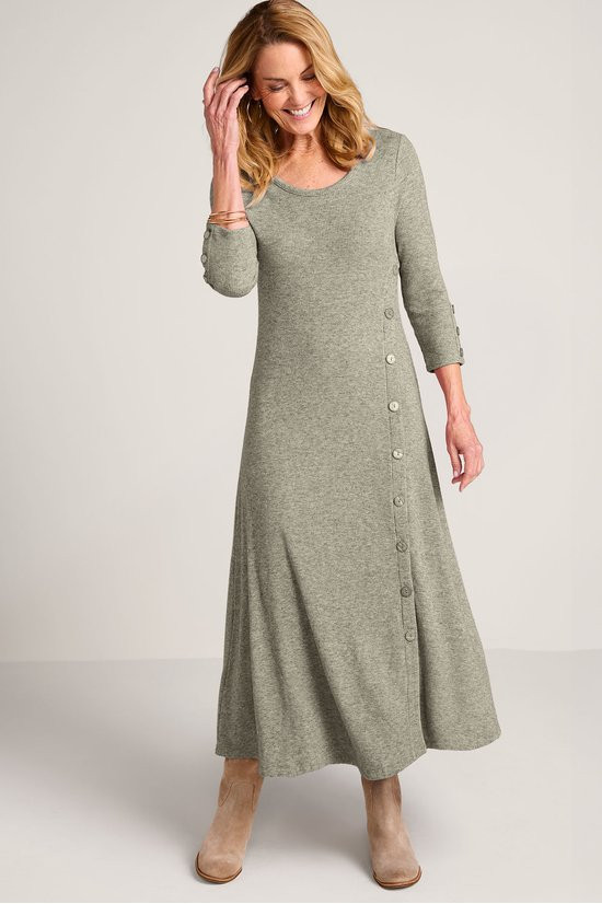 Faux buttons trail down the sleeves and skirt of this midi dress for effortless style, while the final three unbutton to create a front slit. The scoop neck, A-line silhouette is crafted for comfort in a micro-rib knit with a plush, heathered look – and fashioned with 3/4 sleeves and back darts for subtle shaping. It's a put-together piece that's perfectly fit for casual outings and quiet days at home.