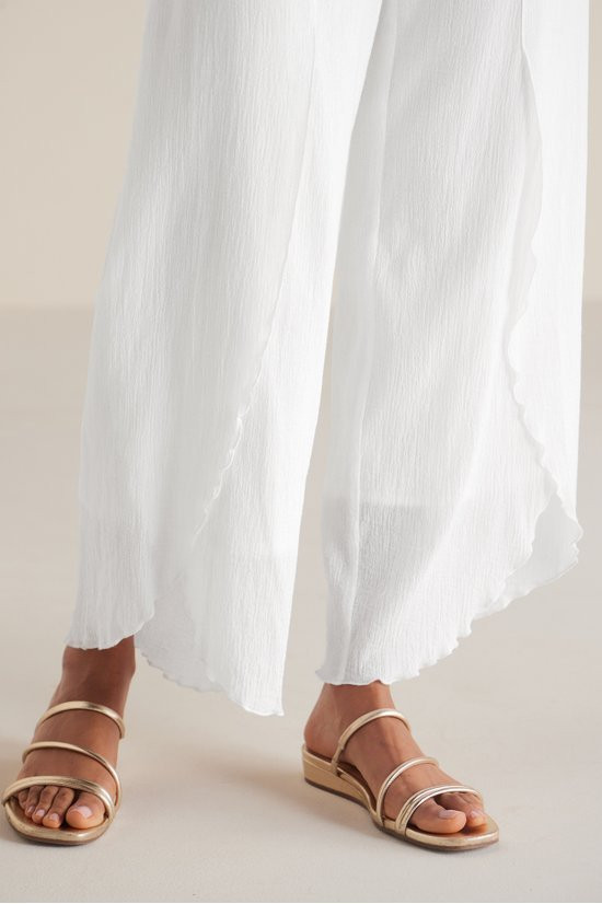 These wide-leg pants feature cotton crinkle gauze with a distinctive faux-wrap design and lettuce-edge tulip hems. The flat front with back elastic waist ensures comfortable fit while cotton voile lining adds coverage. Flowing, breathable fabric makes them ideal for warm weather.