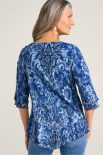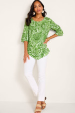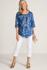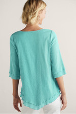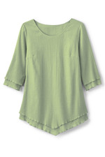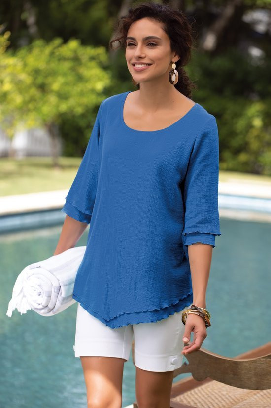This scoop neck tunic features double layers of airy cotton gauze with a crinkled texture and lettuce edging at the 3/4 sleeves and pointed hem. A flattering silhouette that pairs easily with shorts, crops or pants.