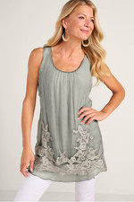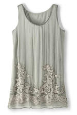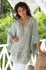 This sleeveless silk tunic showcases vintage-washed metallic cutwork embroidery on a gracefully draped shell over a soft viscose/spandex knit lining. Spot shirring at the center front of the scoop neck adds nice textured detail. Perfect for spring celebrations and dressy events. Made to pair with our Sea Breeze Sweater Shrug (2GV13).