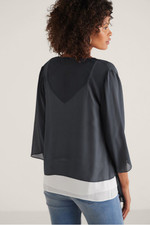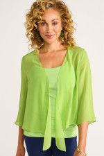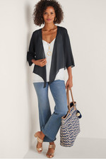This lightweight silk topper offers an open front, 3/4 sleeves, and a flowing hip-length silhouette. Wear it open or tied at the waist for versatile styling. The sheer silk drapes beautifully over tanks, tops or dresses for added coverage.