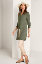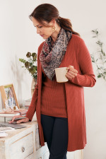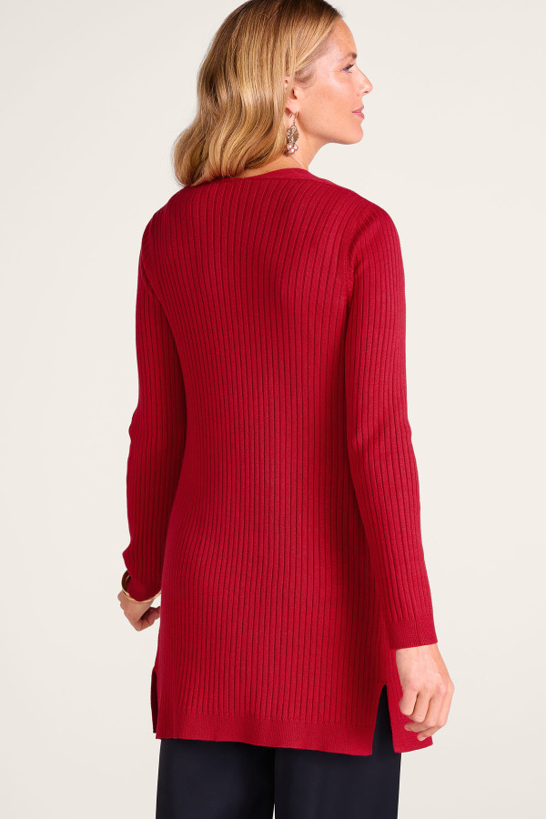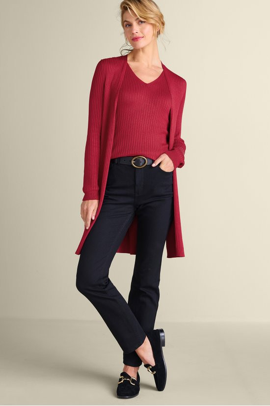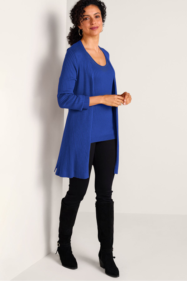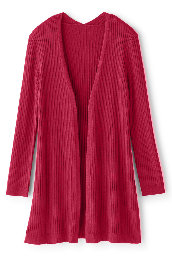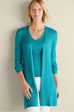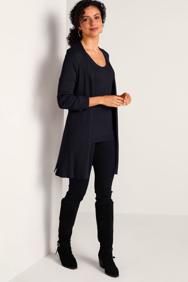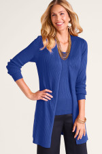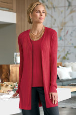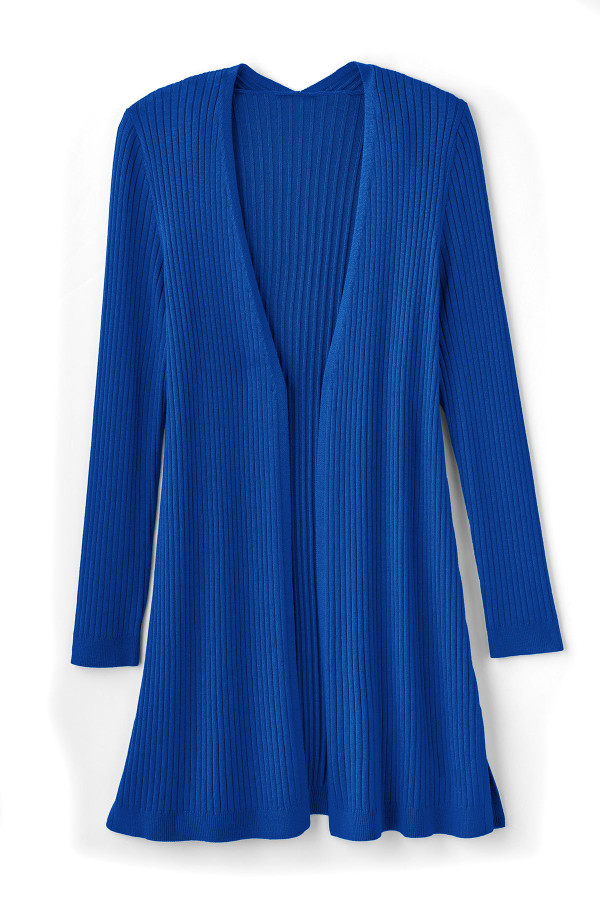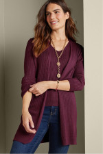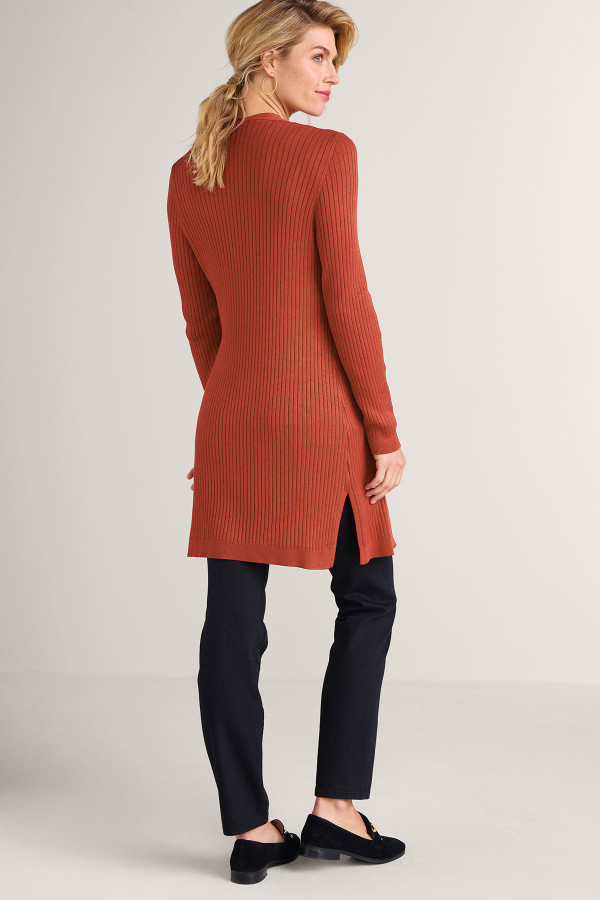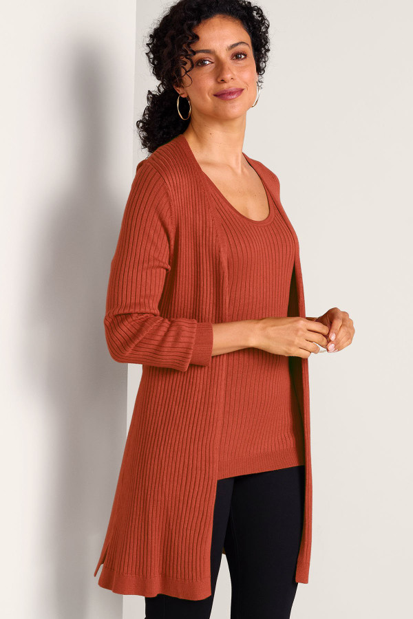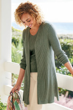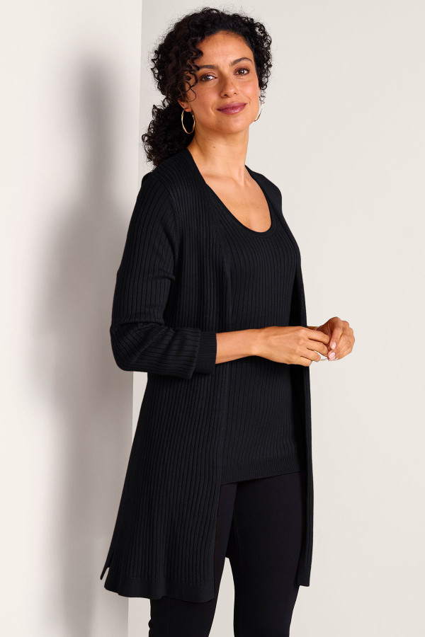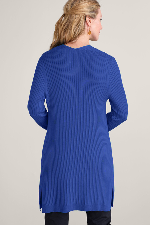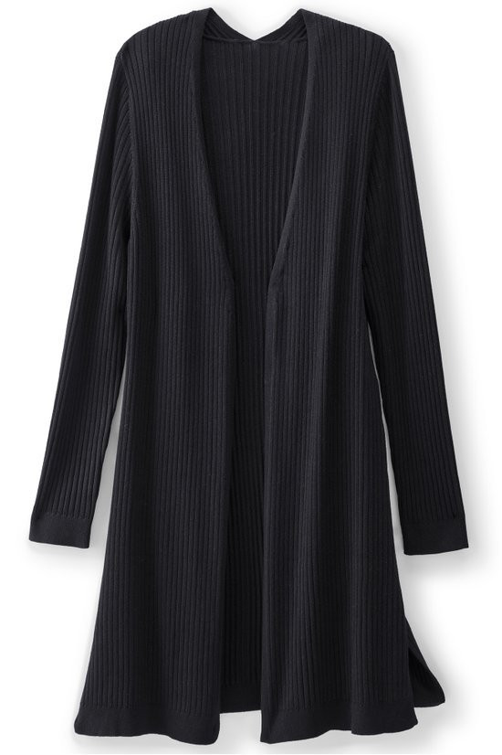 A closet classic that you'll wear season after season, this longline cardigan is made from a finely woven, vertical ribbed knit that feels amazing against your skin. Lightweight and effortless thanks to high side slits, it's the perfect piece to wear over anything and everything. Wear it as a set over the SoftEssential™ Ribbed Sweater Tank (2GF38).