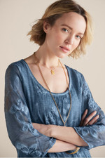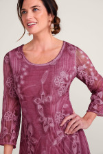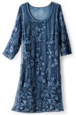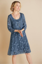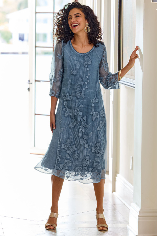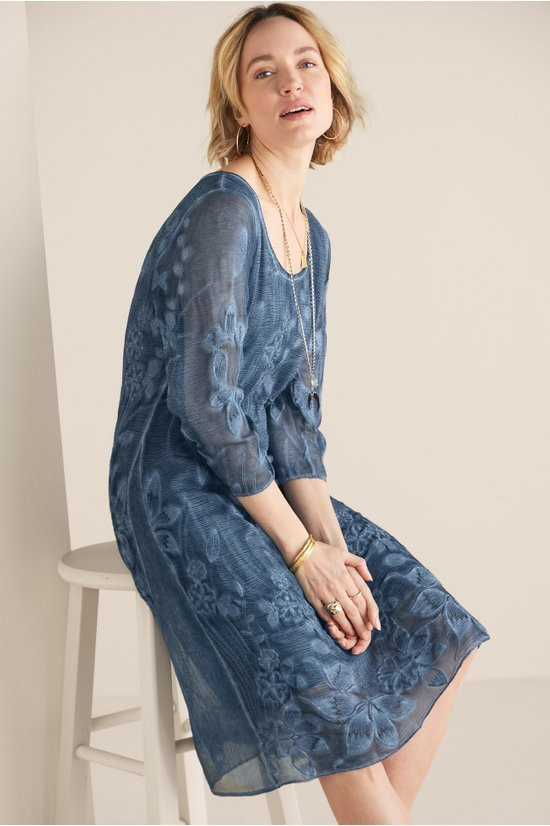 This silk dress makes a statement with its floral-embroidered overlay, creating beautiful dimension atop a soft cotton/spandex knit lining. The lightweight fabric drapes beautifully while a scoop neck and 3/4 sleeves offer flattering detail. Side gussets at the knee-length hem add graceful movement. Its distinctive style is ideal for special occasions.