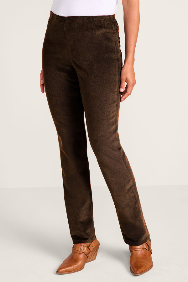 These corduroy straight-leg pull-on pants provide refined comfort. The smooth, flat waistband eliminates bulk while added stretch in the velvety soft, fine-wale fabric ensures comfortable movement throughout your day. The versatile straight silhouette pairs with countless tops and layers, while the back yoke and patch pockets create flattering shape and practical function.