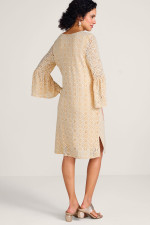 This cocktail dress in lightweight stretch lace pairs a flattering V-neck with 3/4 flounce sleeves. Side slits at the knee-length hem add ease of movement, and the body is lined in stretch crepe. A versatile style for special occasions and events.