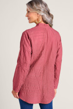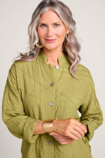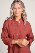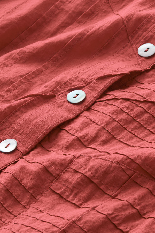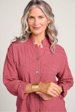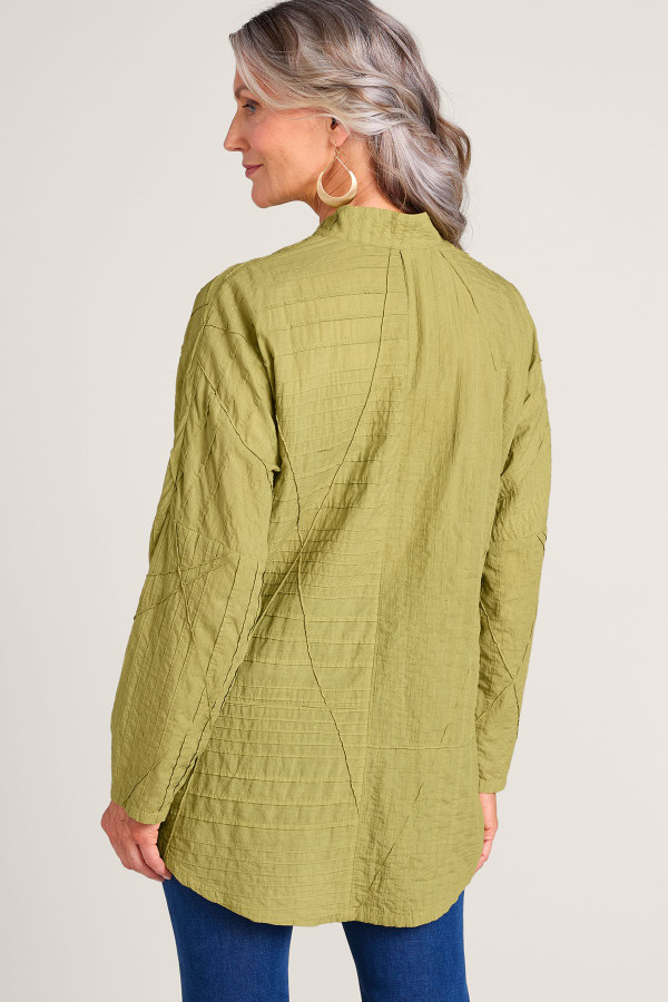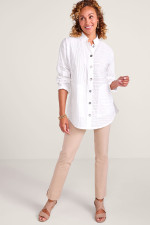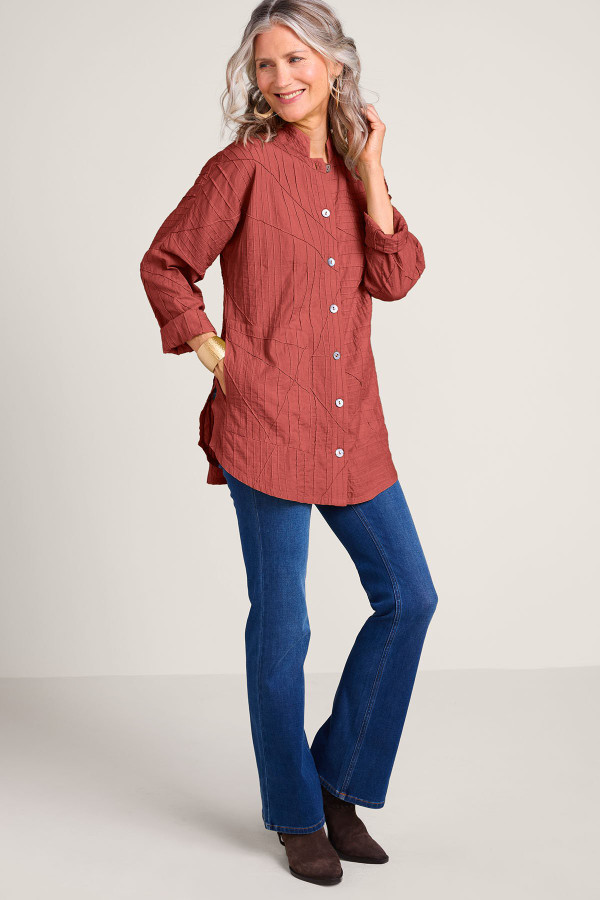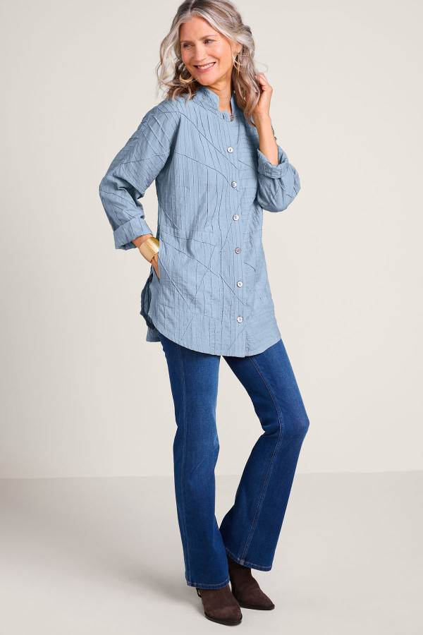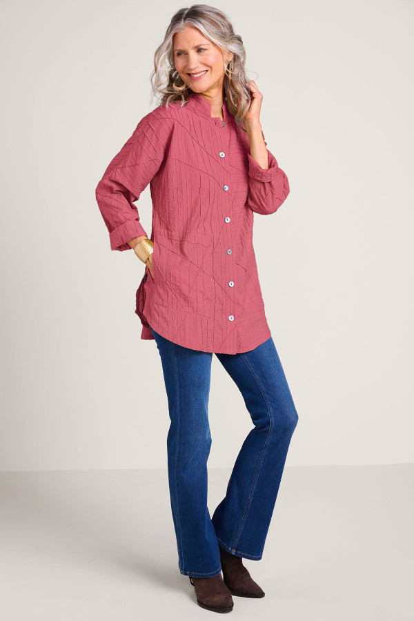 Not your ordinary big shirt—this relaxed button-front style stands out with dimensional, multi-directional pintucks and artful seam details. Finished with a stand collar, dropped shoulders, patch pockets, and a slit curved hem for an effortlessly elevated silhouette.