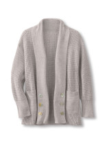 This shawl collar cardigan in midweight cotton showcases a mix of stitches for unique texture. The oversized decorative buttons, open front, dropped shoulders, long sleeves, and patch pockets create relaxed character.