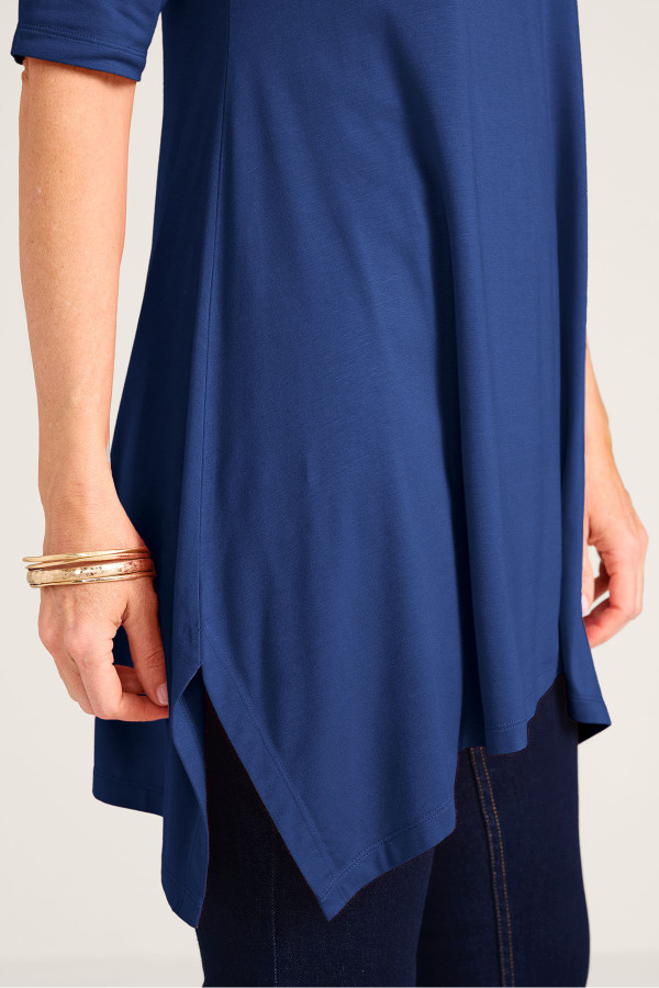 This scoop neck tunic features soft stretch knit with superb drape in an easy, flattering silhouette. The viscose-spandex blend offers comfortable movement while elbow sleeves provide versatile coverage. A shark bite hem adds distinctive shaping to this comfortable everyday essential.