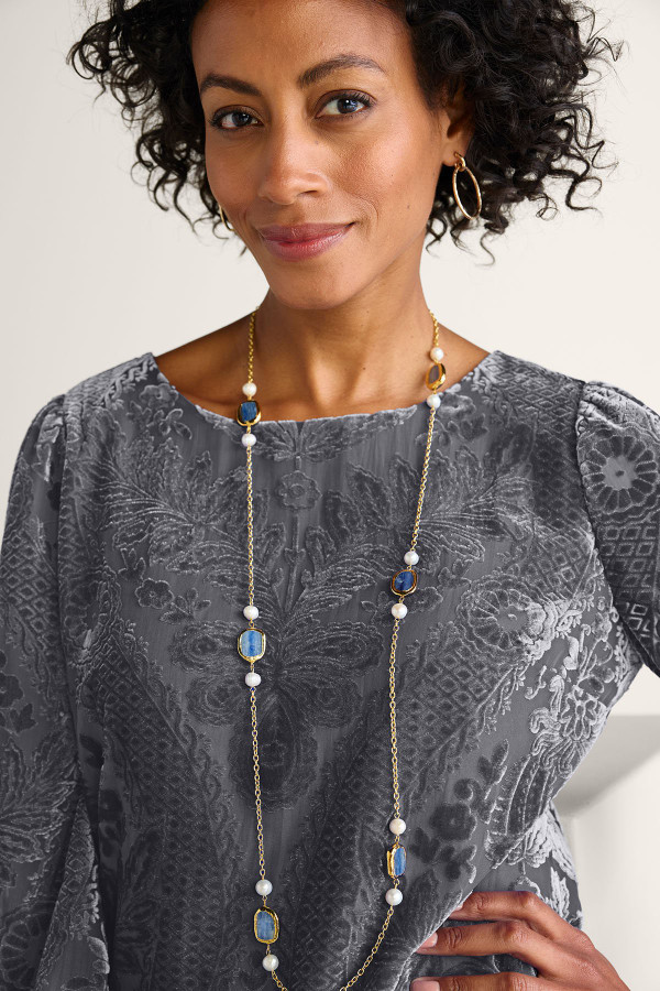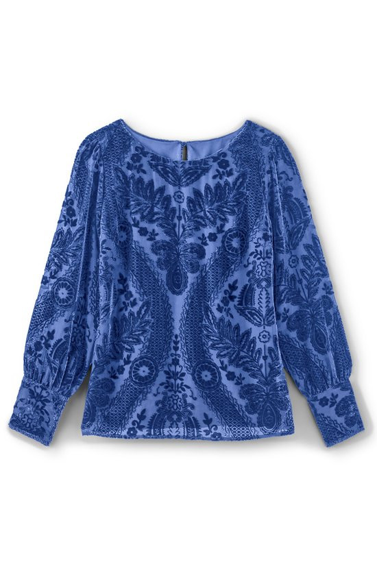 The burnout velvet detail is gorgeous. The hues are to die for. This floral top is altogether feminine and chic, simply magical for the holidays and beyond. Deep statement cuffs on the sheer, billowy sleeves are fastened with covered buttons. Lined body, keyhole back closure.