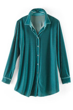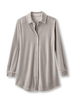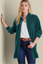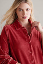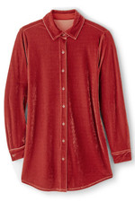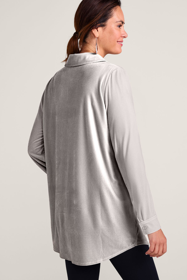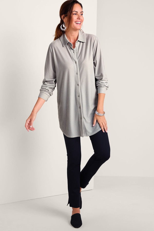 Made from our super-soft stretch velvet, this button-down tunic offers both elevated style and everyday ease. The relaxed, longer-length silhouette is cozy and comfortable with jeans or leggings, while plush fabric in rich hues adds a touch of luxury.