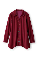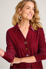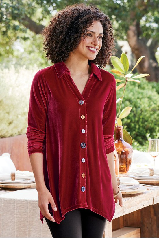 The flattering, versatile Danielle knit tunic – now in lustrous stretch velvet for a dressed-up feel. Finished with the signature shirt collar, eclectic buttons and shark bite hem you love, it's ready for events big and small.