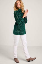 Gorgeous velvet burnout, in a rich shades, puts your must-have turtleneck in a celebratory mood just right for the season's best parties. Fully lined body with lightly sheer, buttoned sleeves. Side slits, back neck ruching.