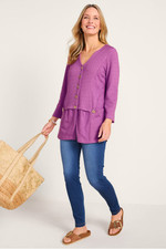 Get double the texture, double the flattery with mixed knits of jacquard and slub. This 3/4-sleeve big shirt is designed with engraved coconut buttons and pockets.