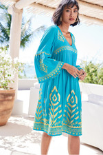This knee-length dress features golden embroidery accenting cotton crinkle gauze for signature artful appeal. The empire waist creates flattering drape while flounce 3/4 sleeves add feminine detail. Breathable cotton gauze offers comfortable movement in warm weather. Runs large; consider sizing down.