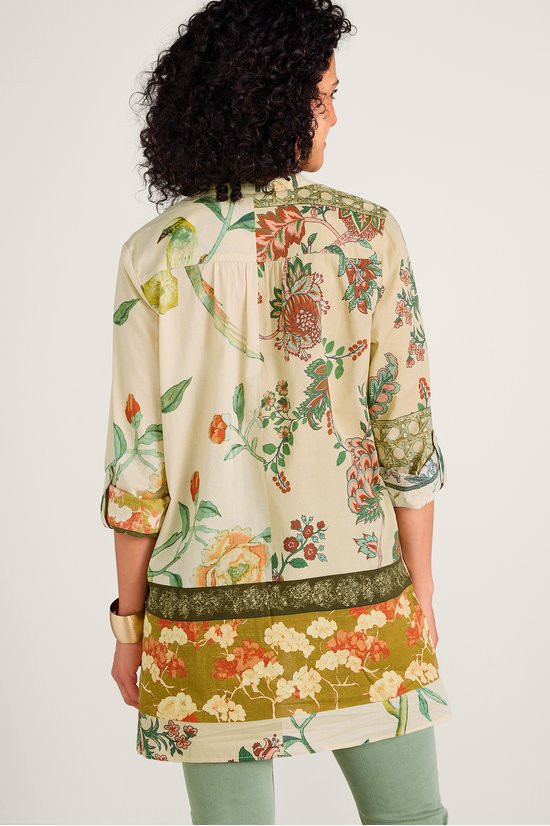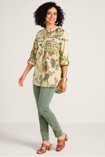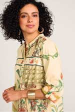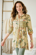 Prints and pintucks pair in perfect harmony on this collared popover. It’s sewn from a lightweight cotton voile, with a partial button placket, shirring at the back yoke and a curved, high-low hem that skims the body. Finished with long roll-tab sleeves, it goes with everything from denim to ponte.